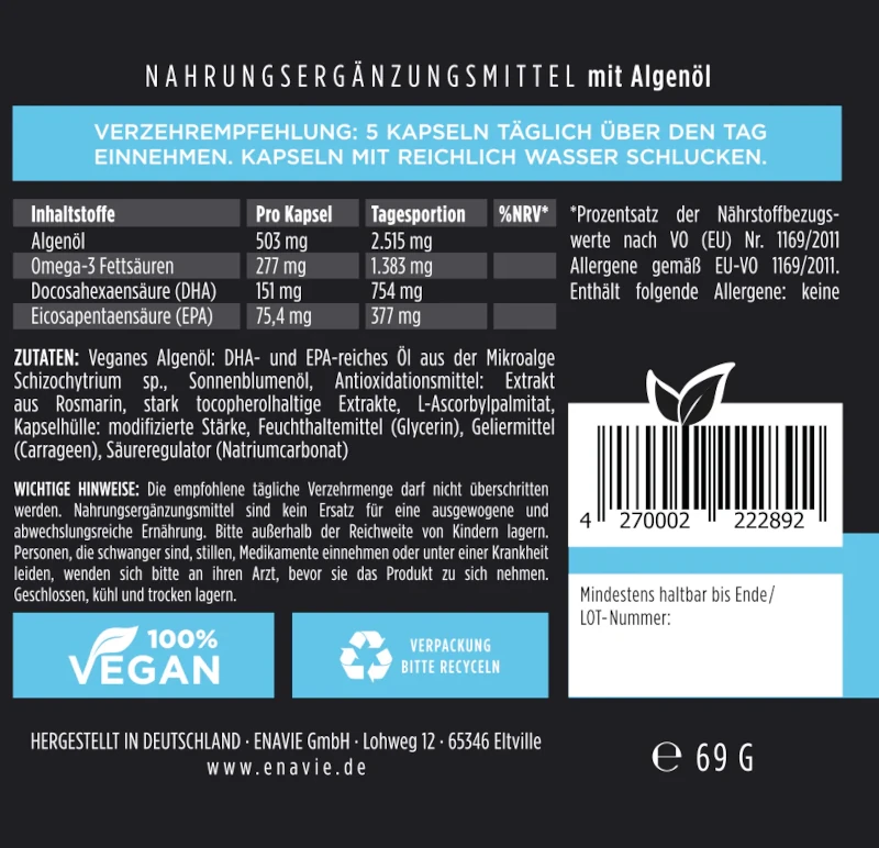 - Pro Tagesportion: 754 mg DHA & 377 mg EPA